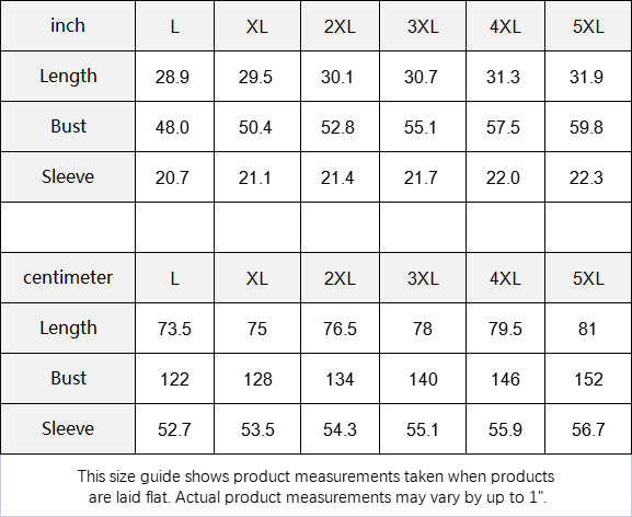| inch | L | XL | 2XL | 3XL | 4XL | 5XL |