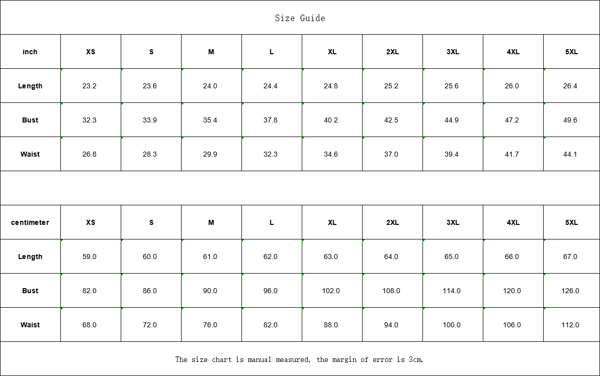 | inch | XS | S | M | L | XL | 2XL | 3XL | 4XL | 5XL |