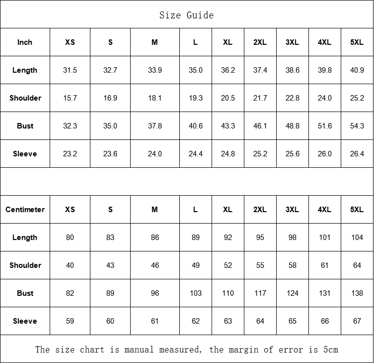Inch XS S M L XL 2XL 3XL 4XL 5XL