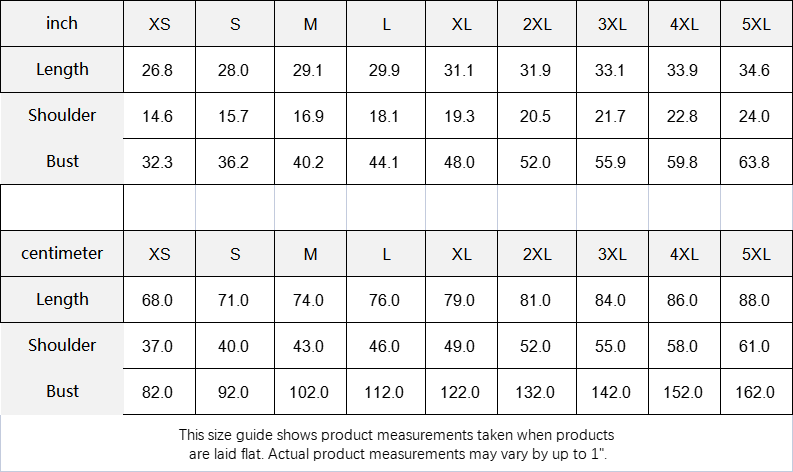 This size guide shows product measurements taken when products are laid flat. Actual product measurements may vary by up to 1".