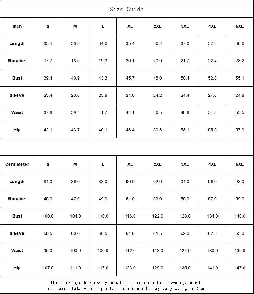 | Centimeter | S | M | L | XL | 2XL | 3XL | 4XL | 5XL |