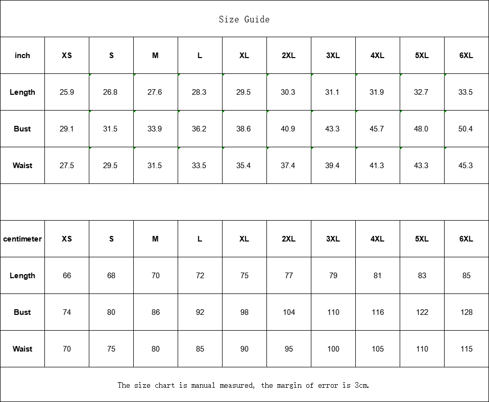 | inch | XS | S | M | L | XL | 2XL | 3XL | 4XL | 5XL | 6XL |