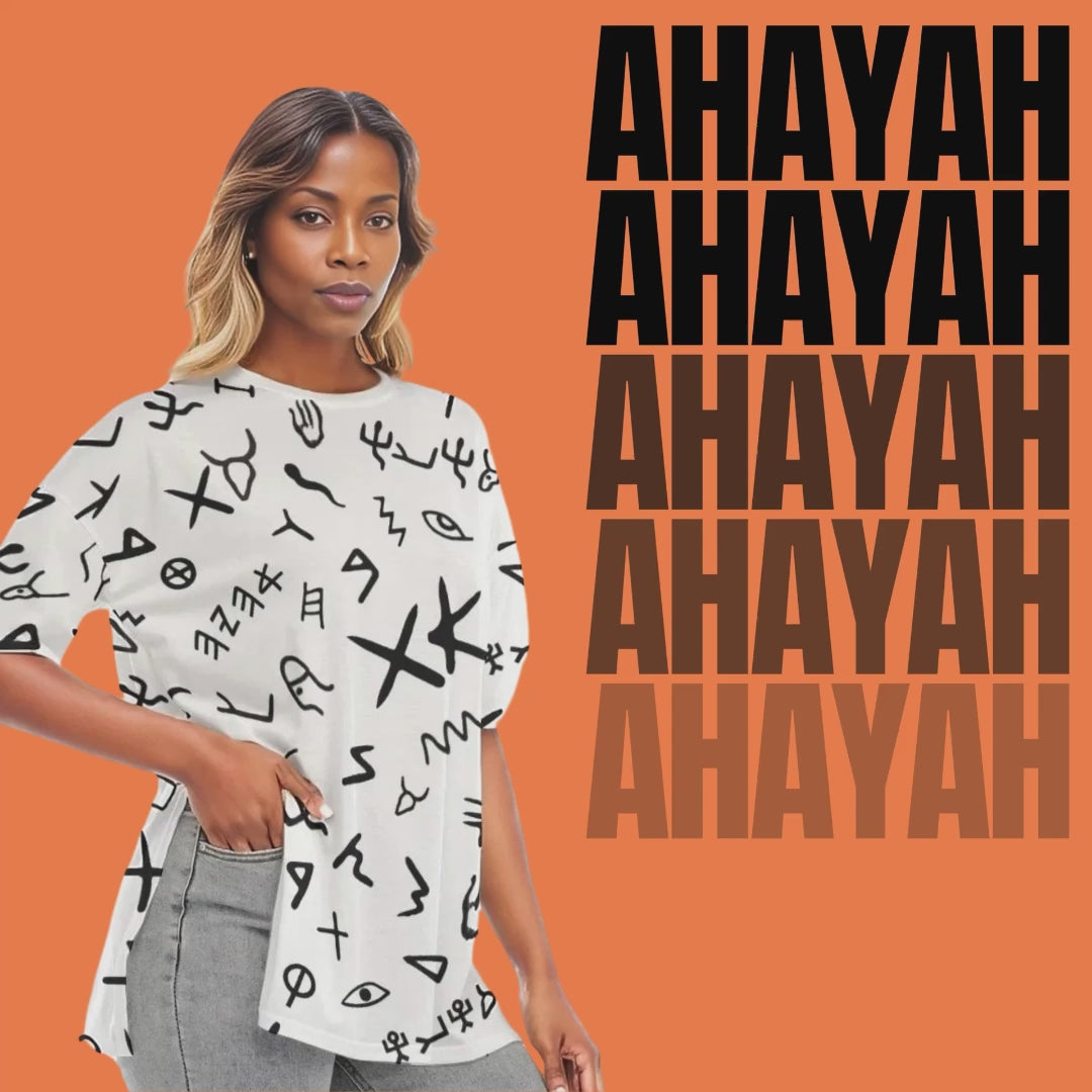 AHAYAH Ancient Paleo Phoenician Pictograph Alphabet Pattern T Shirt With Side Splits