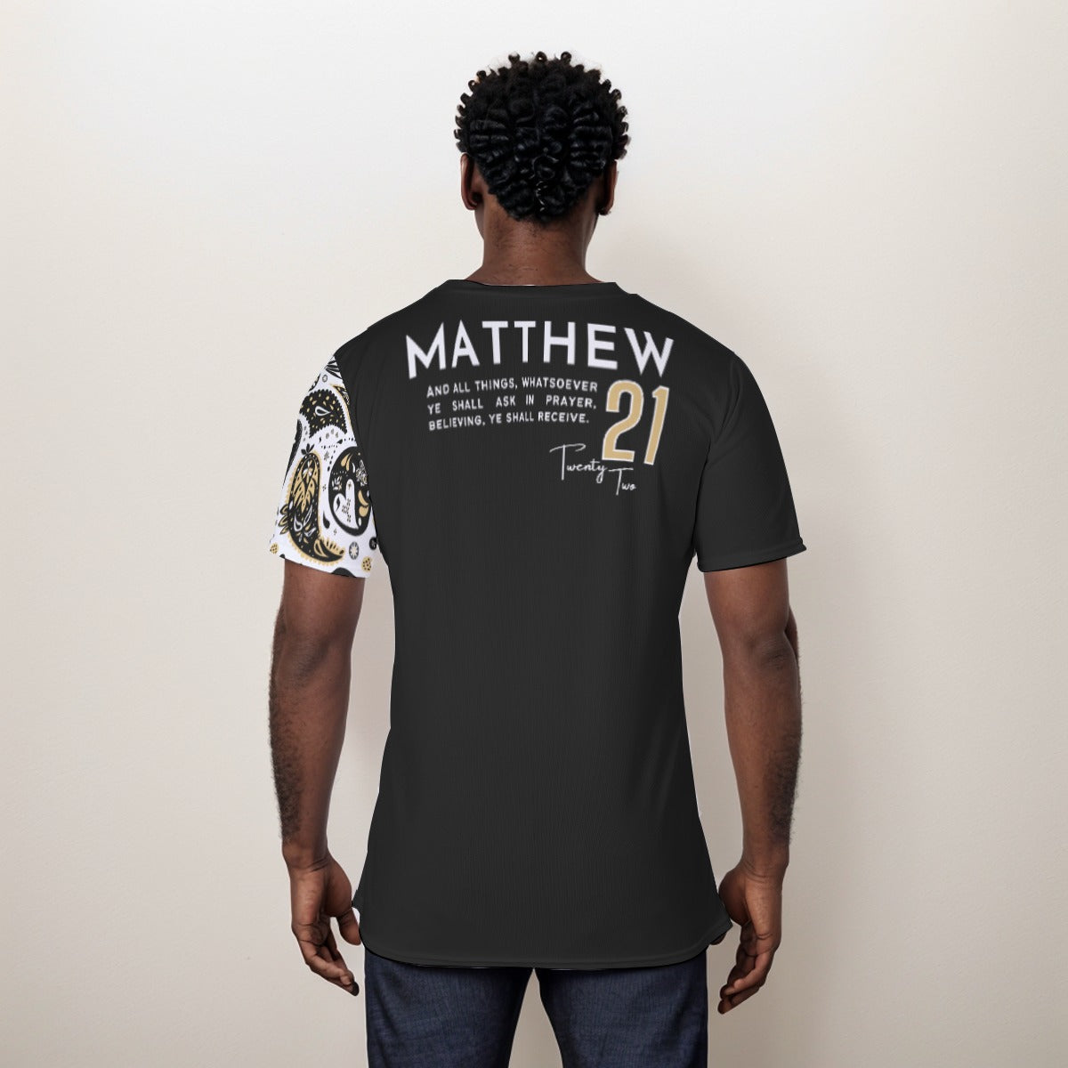 PRAY Matthew 21:22 Scripture Paisley Sleeve Black T Shirt