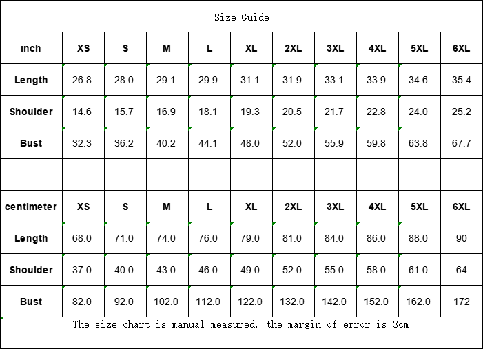| inch | XS | S | M | L | XL | 2XL | 3XL | 4XL | 5XL | 6XL |